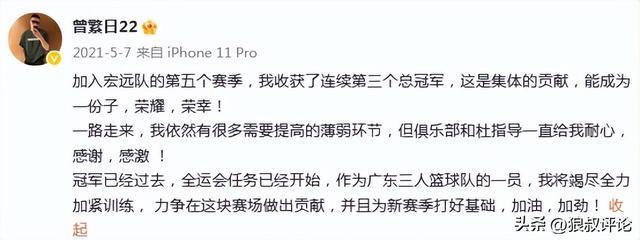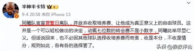 随后,南京同曦放弃了收取转会费,曾繁日恢复自由球员身份后,社媒感谢南京同曦的重用和培养。